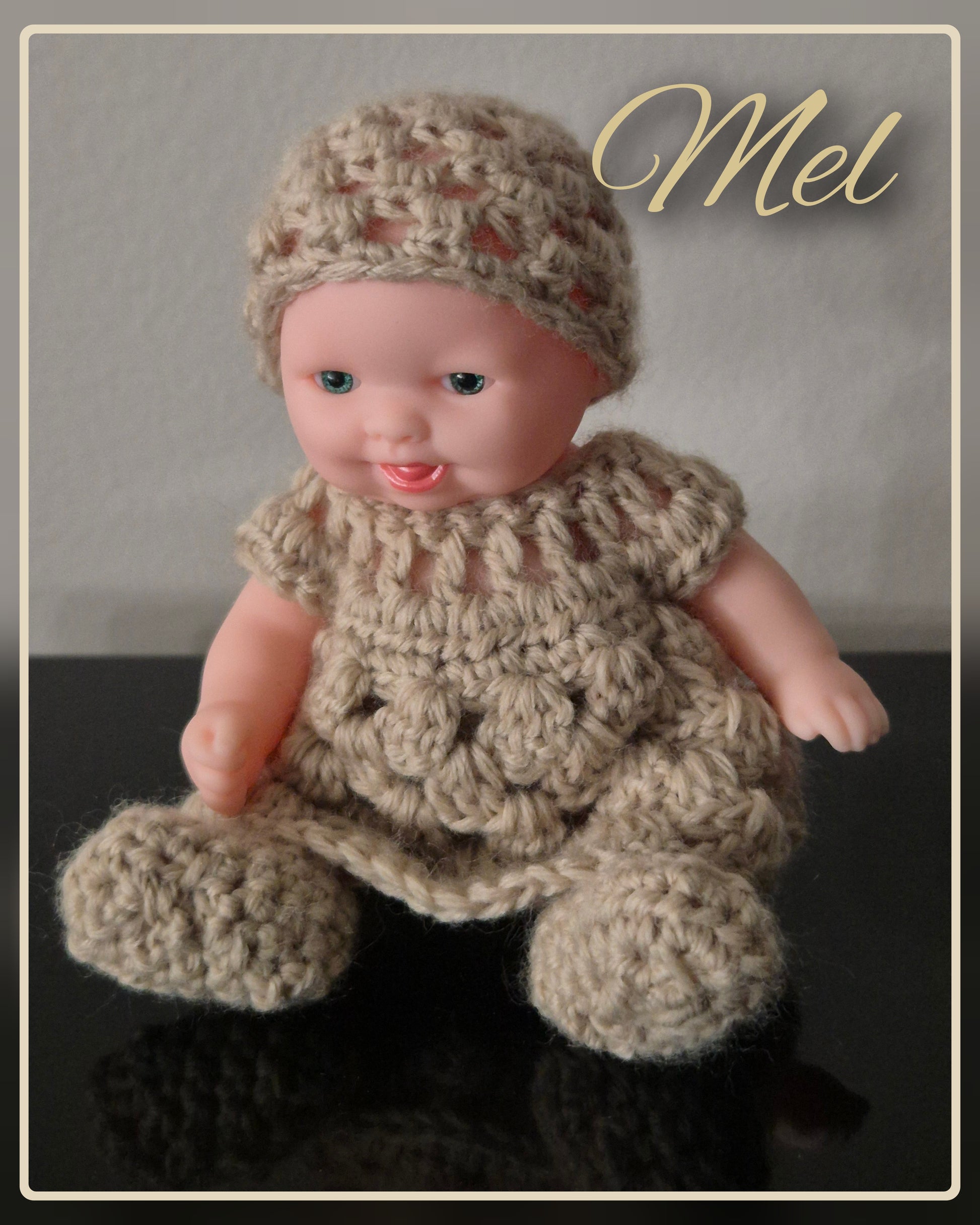 Gorgeous dolls in neutral coloured crochet outfits. Outfit includes beautiful crochet dress with hat, knickers and bootees. So many gorgeous dolls to choose from.