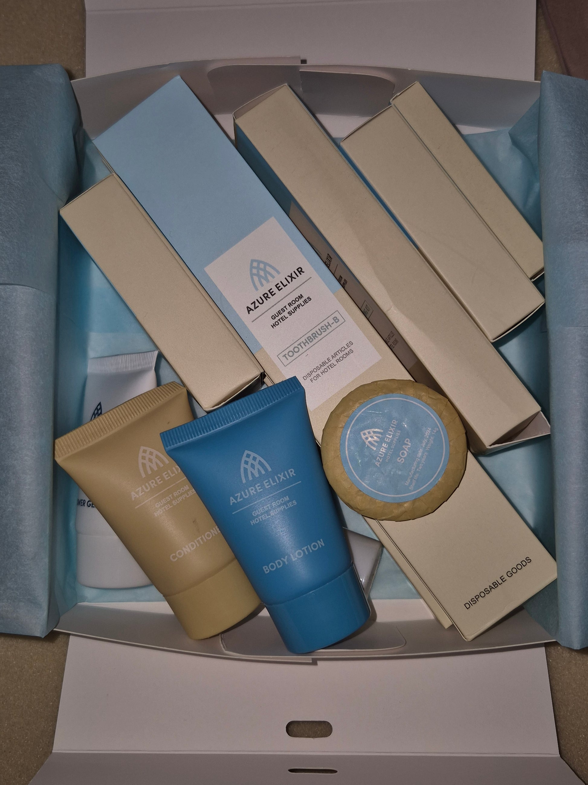 Ideal for workers in remote accommodation, motel stays, air bnb, or even just family. Place it out for guests, or take with you on short trips away. Compact, comprehensive, convenient; this 'Azure Elixir' boxed amenities set is a must for travellers.