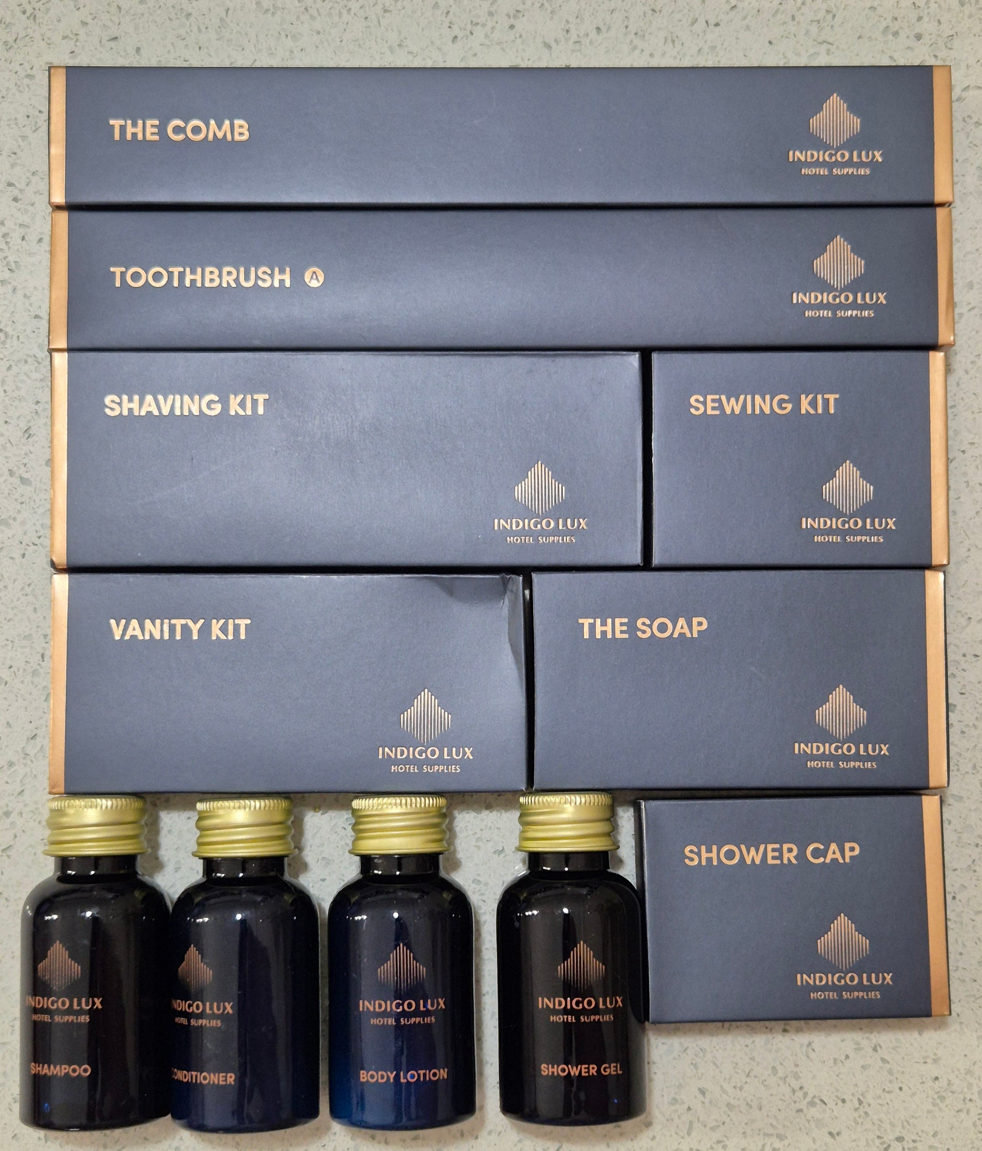 Ideal for workers in remote accommodation, short term rentals, motel stays, air bnb, or even just family. Place it out for guests, or take with you on short trips away. Compact, comprehensive, convenient; this 'Indigo Lux' boxed amenities set is a must for travellers.