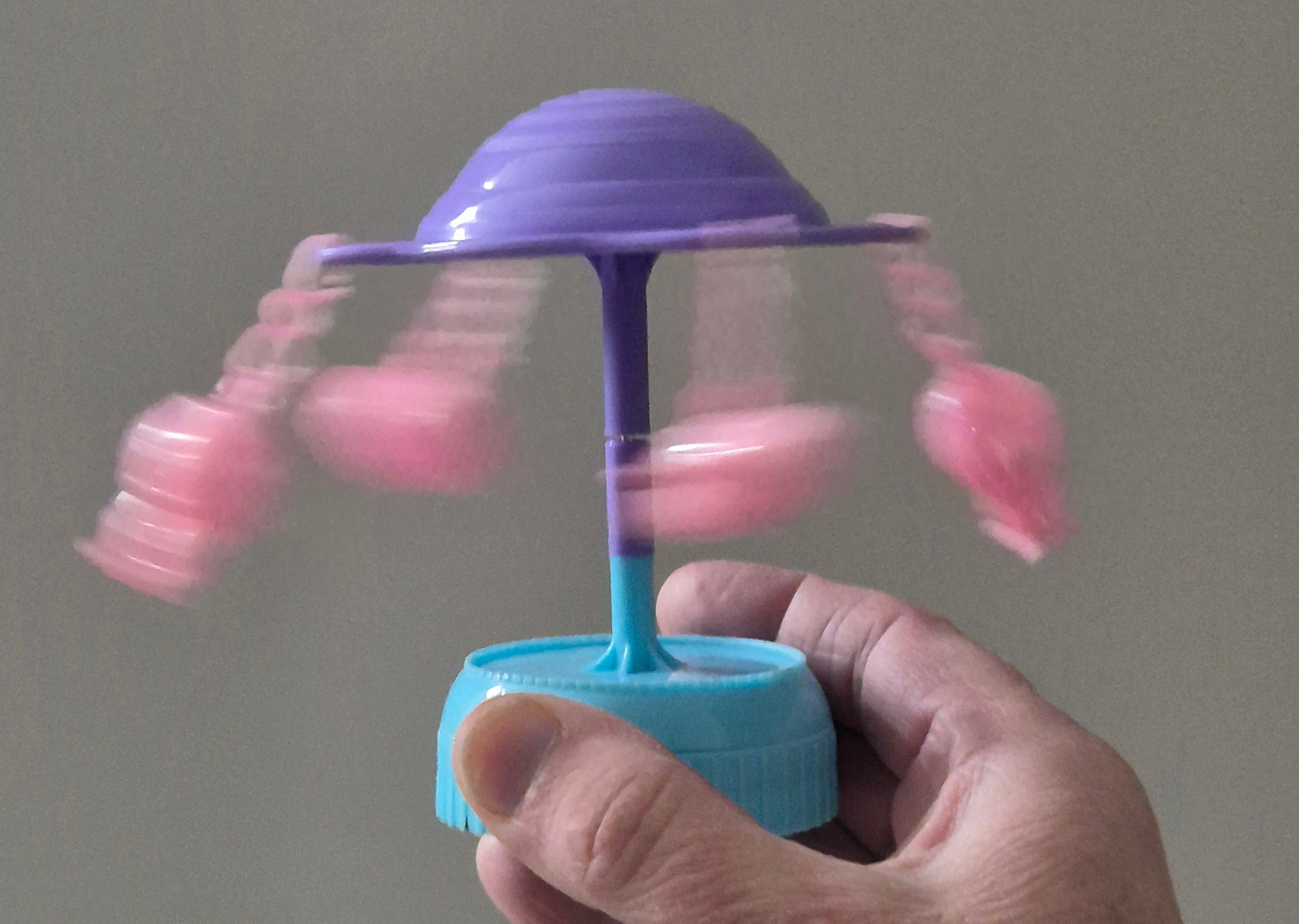 Mini Space-y Fairground Ride Fidget Toy with astronauts, space ship and flying saucer. Press in the yellow button to make it spin. Approx. 9cm high, so will fit in hand bag.