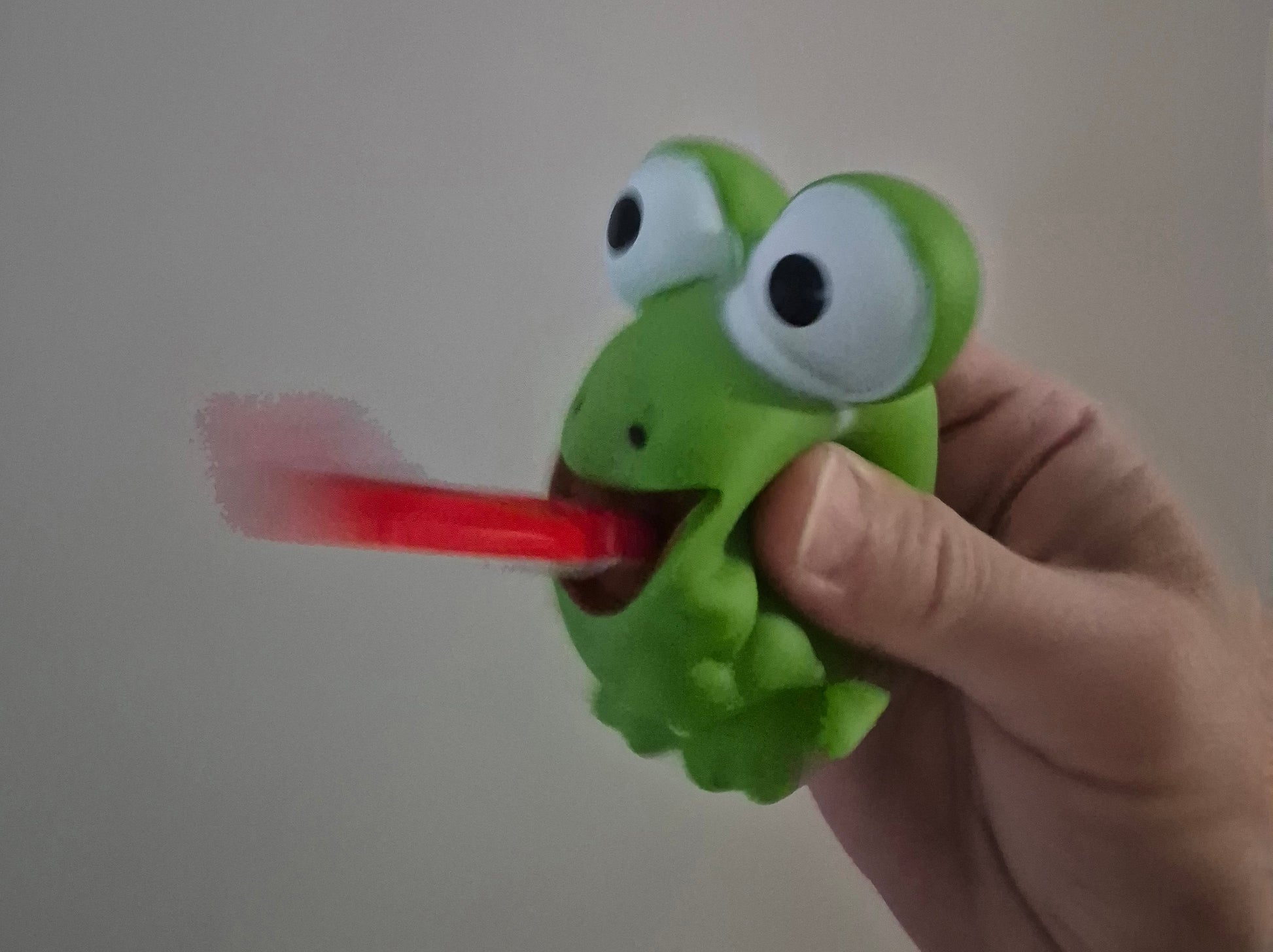 Squeeze the frog and his tongue unrolls with a squawk.